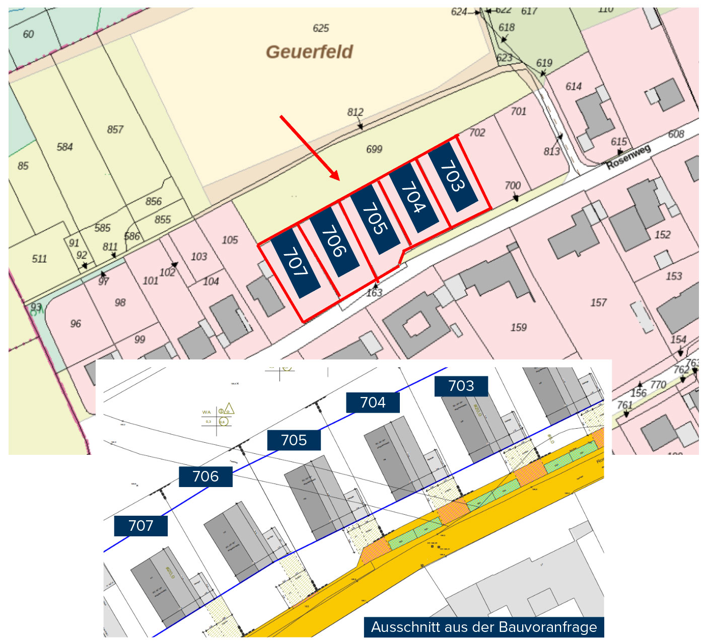 Zum Verkauf stehen fünf sehr ruhig gelegene Baugrundstücke in ländlich-idyllischer, aber dennoch zentraler Wohnlage. Das baureife Grundstück ist derzeit als Wiese angelegt, aber bereits verkehrlich durch den angrenzenden Rosenweg erschlossen, in dem sich auch alle Ver- und Entsorgungsleitungen bereits befinden.